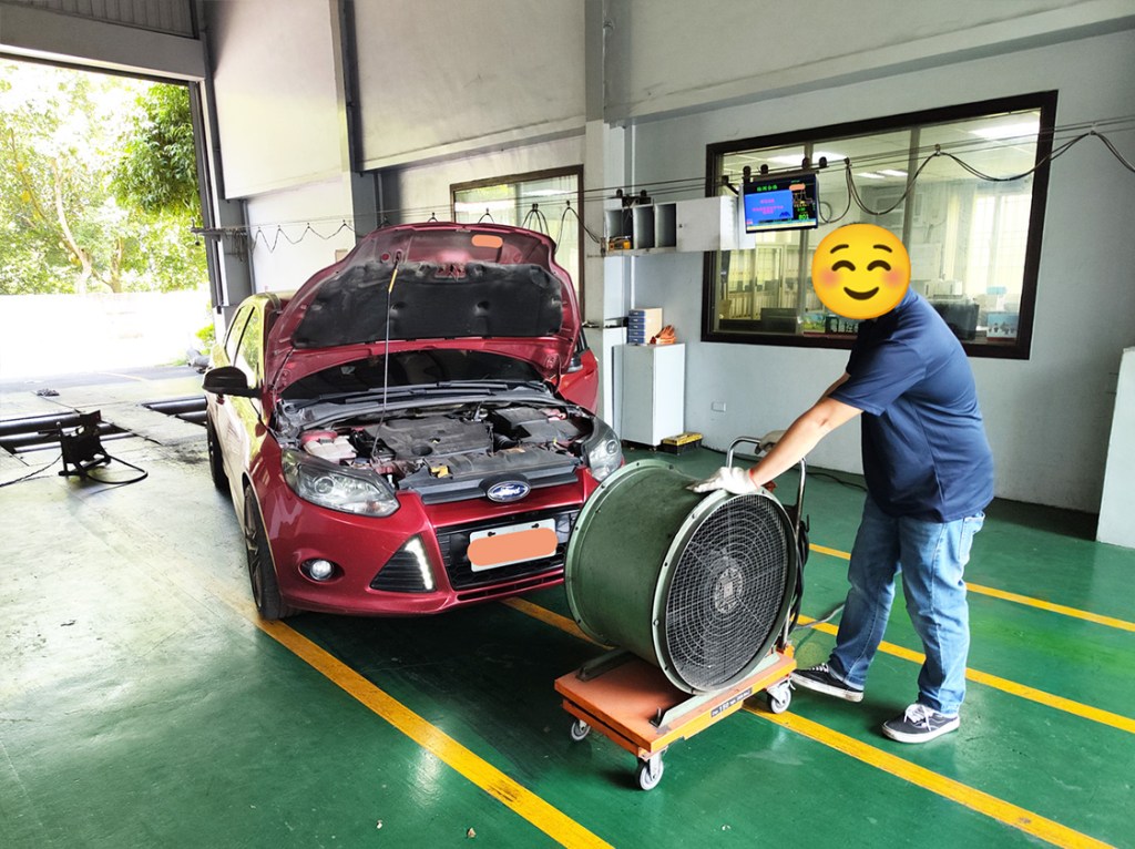 先拍車牌作紀錄,接著一台一台排隊進廠驗車,首先先開啟電風扇,模擬行車時的進風狀態,接著技師會進入車內依照螢幕指示踏油門